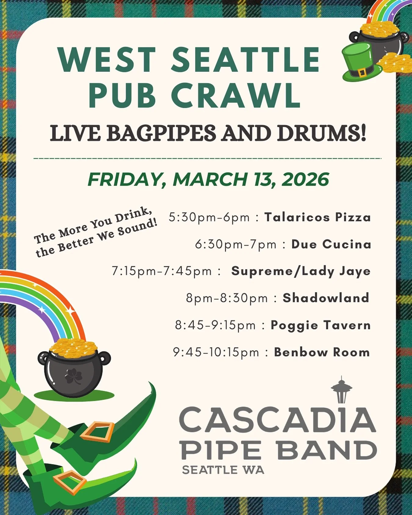 Cascadia Pipe Band, united by a passion for music, is driven to compete with excellence while fostering a welcoming and fun community.