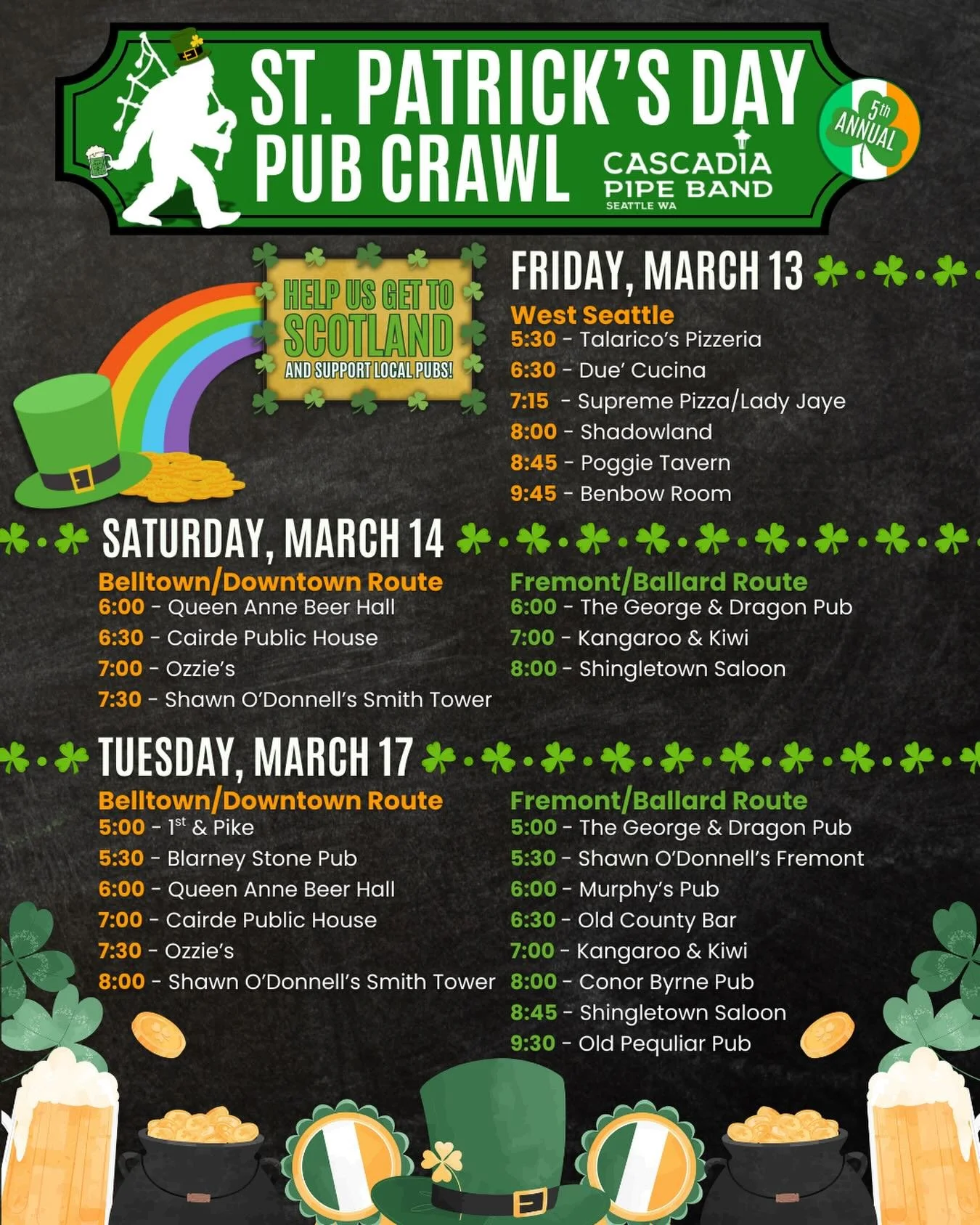 St. Patrickโs Day Pub Crawl - March 13, 14, and 17, 2026
